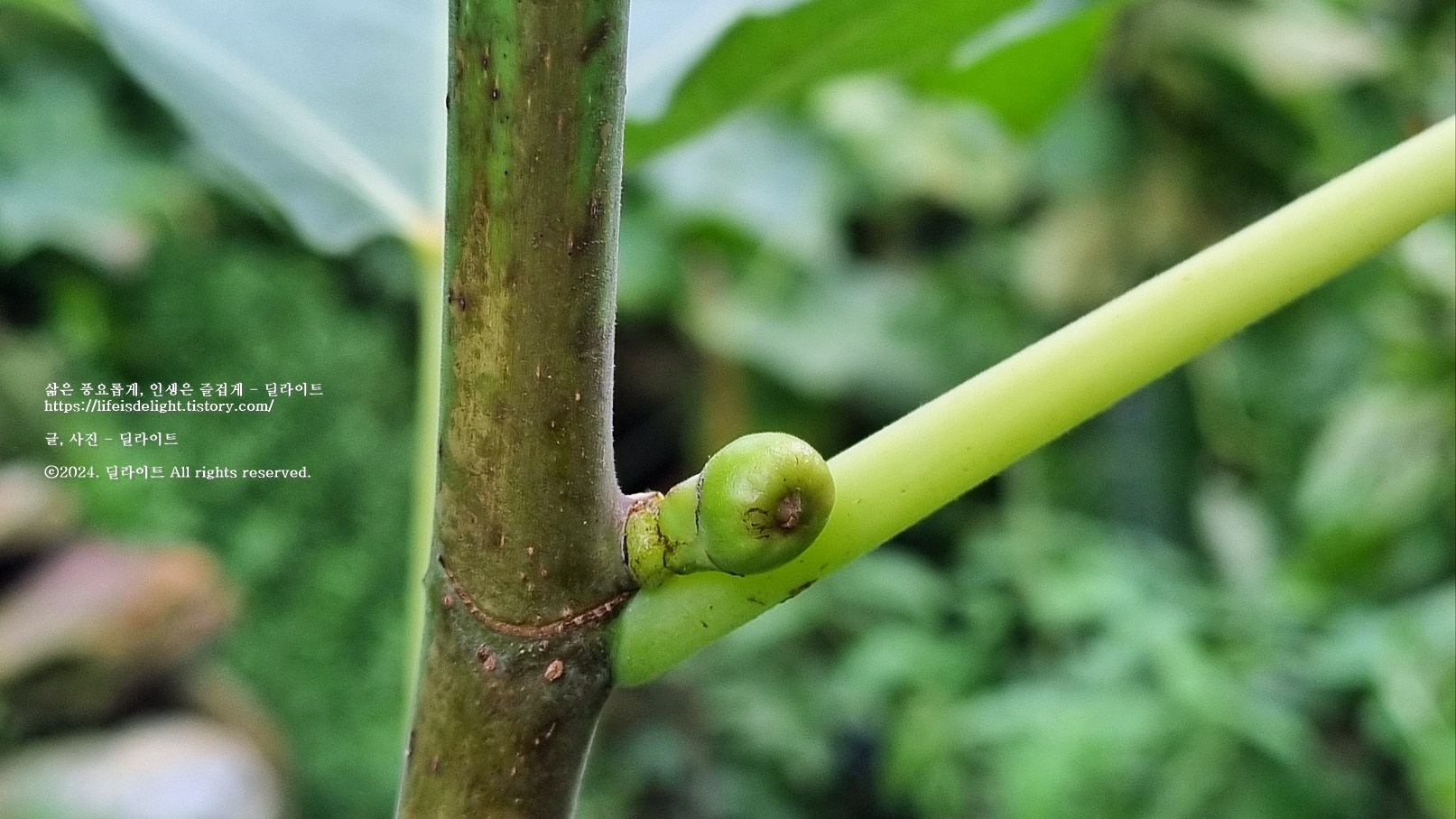 이런 내 마음과는 다르게 무화과가 열리는 시기인 한 여름에도 열매는 나올 기미를 보이지 않아 내심 올해는 포기하고 있었던 차였는데 주말에 살펴보니 글쎄 마디 마디에 열매가 열리기 시작하였다. 세상에 !!