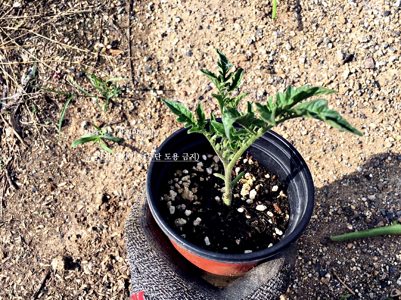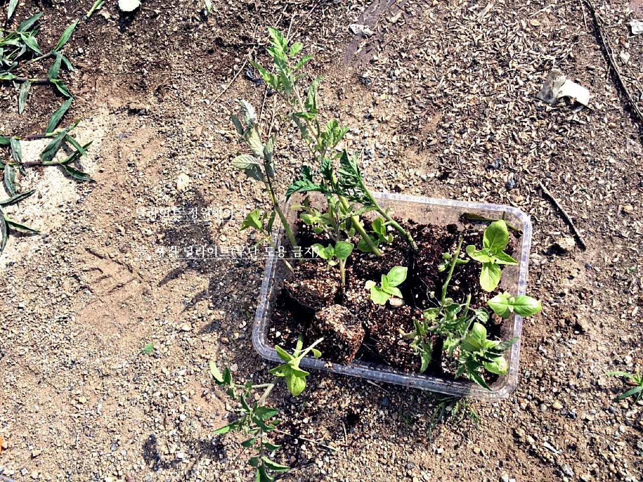 총 7개의 설탕 방울 토마토와 2개의 흑토마토 모종을 정식 해 주었다. 하나 하나 들어서 뿌리를 확인 해 보니 모두 튼튼하게 뿌리가 잘 내렸다. 세발자국 텃밭이라 토마토를 심을 자리를 만드느라 고생했다. 방울토마토든지 일반 방울 토마토든지 잎이 자라며 자리를 어느정도 자치를 하기 때문에 심을 때부터 간격을 두고 심어 주는 것이 좋기 때문이다. 그런데.... 코딱지만한 텃밭에 바질까지 함께 심어 주다보니 바짝 바짝 심어 주게 되었다. 나중에 서로 엉키지 않게 하려면 부지런히 줄기를 정리 해 가며 키워야겠다.