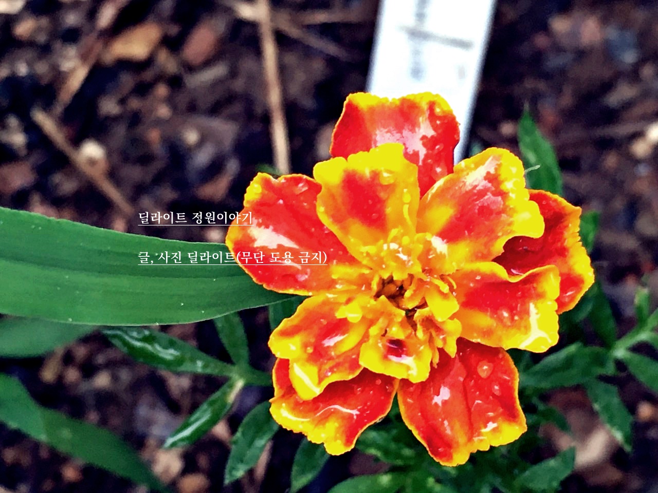 옮겨 심은지 한달 정도 지나니 작은 줄기에서 꽃이 피기 시작했다. 아마 진작에 옮겨 심어 주었다면 조금 더 자란 상태에서 진작에 꽃이 피었을 수도 있었겠구나 싶었다. 거의 모종 크기(?)만한 식물에서 꽃이 피어서 그런지 생각보다 꽃이 크지는 않았다. 꽃을 보고 나서야 메리골드라는 것을 명확히 확인 할 수 있었다. 메리골드의 꽃은 처음 보는데 꽃 크기는 작지만 겹겹의 꽃이 참 예뻤다. 붉은색 꽃잎에 노란색 물이 든 모습이였다.