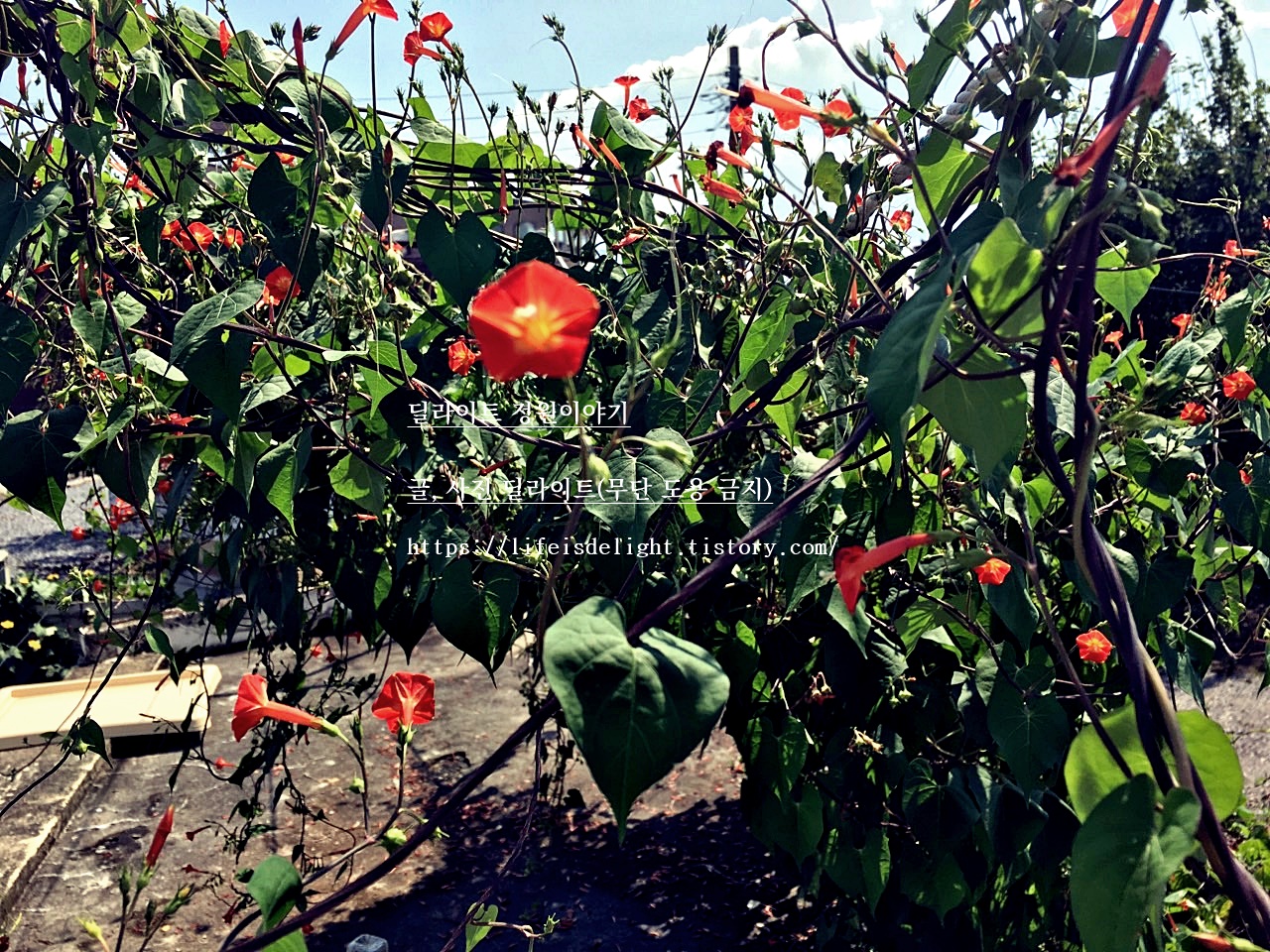 개화 시기는 6월부터 9월사이인데 이 전까지는 드문 드문 피기 시작하더니 9월이 되자 한꺼번에 개화를 시작했다. 아직 푸른 잎들과 파란 하늘, 그리고 진홍색의 유홍초 색이 퍽 잘 어울려 한동안은 매일매일 옥상을 올려다보기 바빴다. 지주대만 잘해준다면 덩굴을 잘 유인해 그늘막으로도 잘 사용할 수 있을 것 같은데 왜 생태 교란종이라고 했을까.