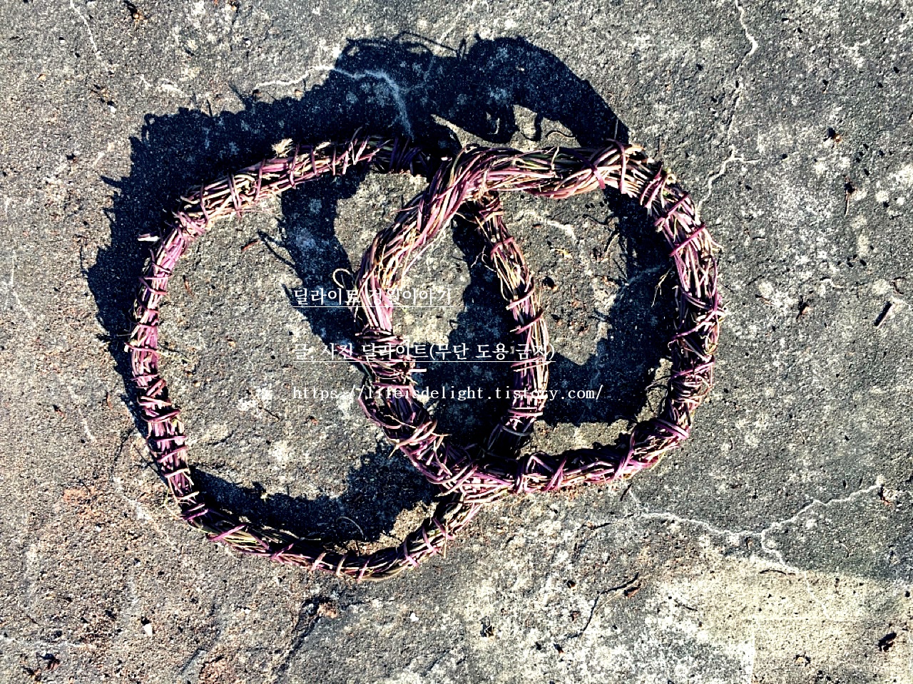 만드는 과정은 어렵지 않았다. 원래 자기들끼리 둘둘 말려 있던 줄기들을 그대로 활용하여 리스의 크기를 잡아 주었고 그 중에 한두 줄기를 빼서 리스가 견고해질 수 있도록 감아 주었다. 이번에는 노끈도 일절 사용하지 않고 오로지 식물 줄기로만 만들었기 때문에 망가지거나 부서져도 부담 없이 밭에 잘라 버려도 된다. 유홍초 줄기를 이용해서 메인 틀을 감고 난 후 끝에 약 5cm 정도는 틀 사이사이에 집어넣어 풀리지 않도록 해 주었다.