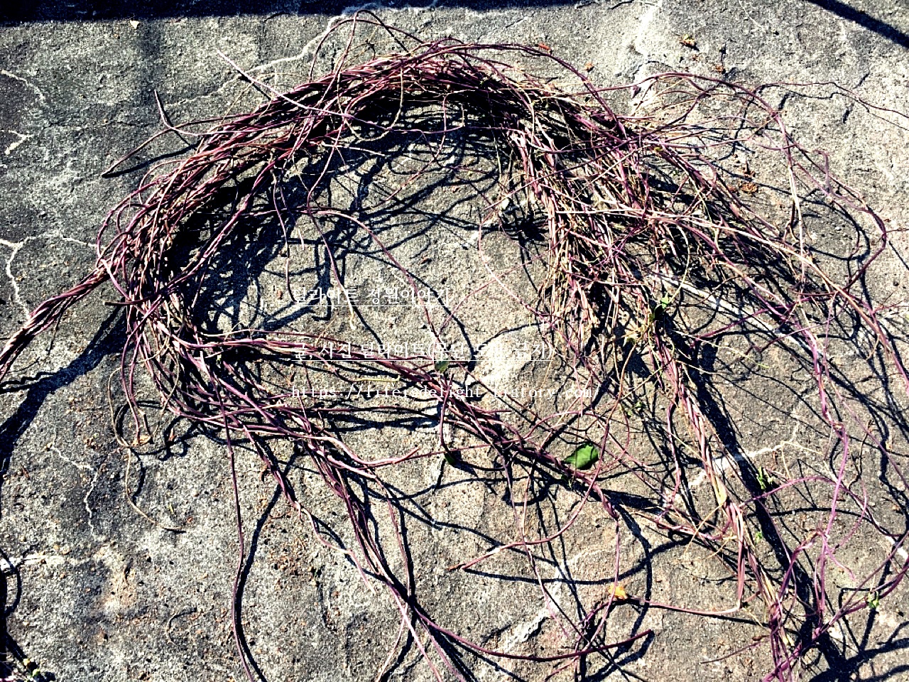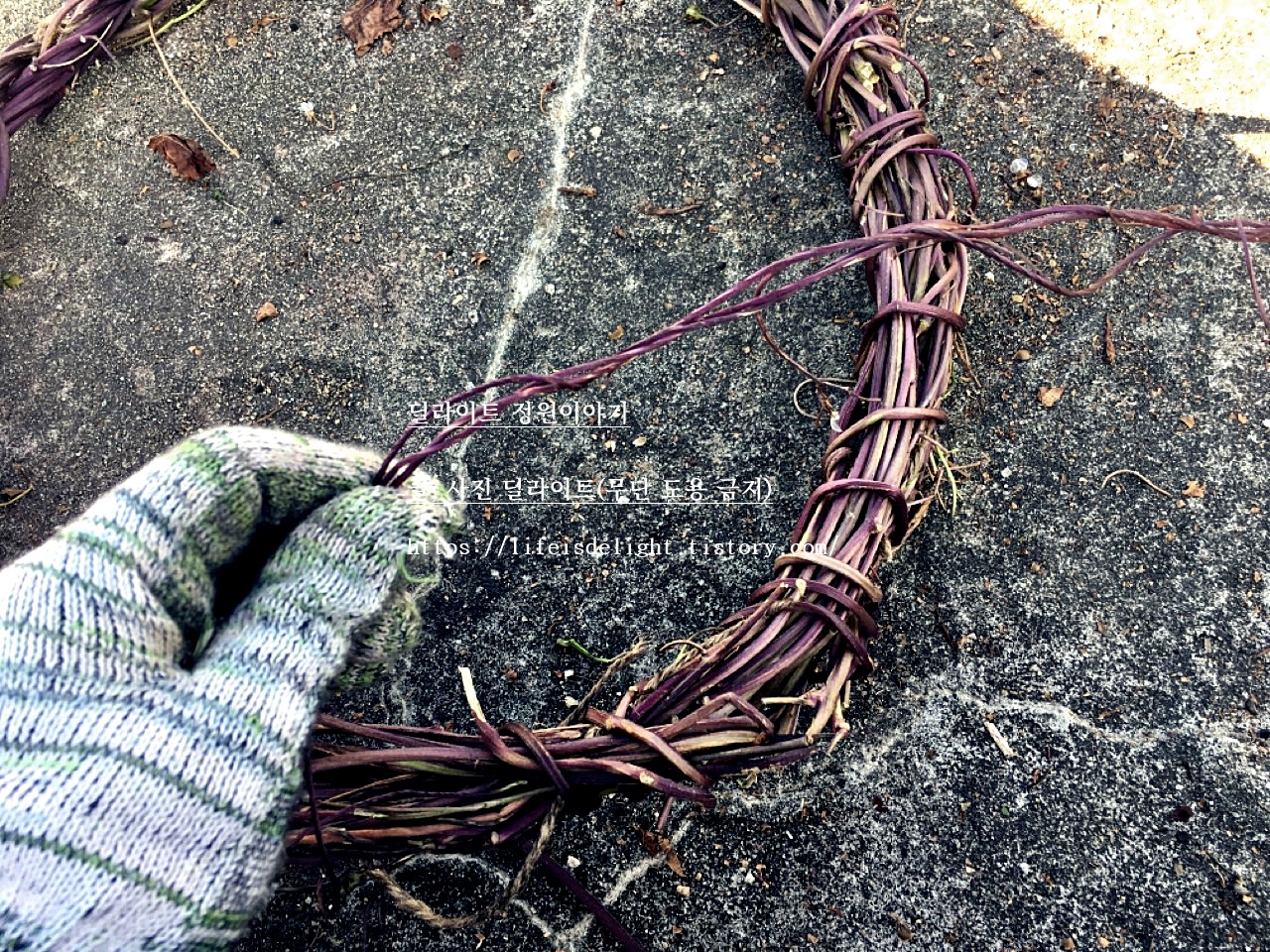 둥근 잎 유홍초를 거두다가 줄기를 보니 나름 탄성이 있고 쉽게 부러지지도 않는다는 것을 알게 되었다. 쓸모의 발견. 서로 줄기를 꼬아가며 자란 부분을 보니 이 둥근 잎 유홍초 줄기로 리스 틀을 만들어 주면 좋을 것 같다는 생각이 든 것이다. 가끔씩 텃밭에 심은 꽃들이나 허브들을 이용하여 리스를 만들었는데 기본이 되는 틀 없이 그저 식물끼리만 엮었기 때문에 조금 아쉬움이 있었던 차였다.