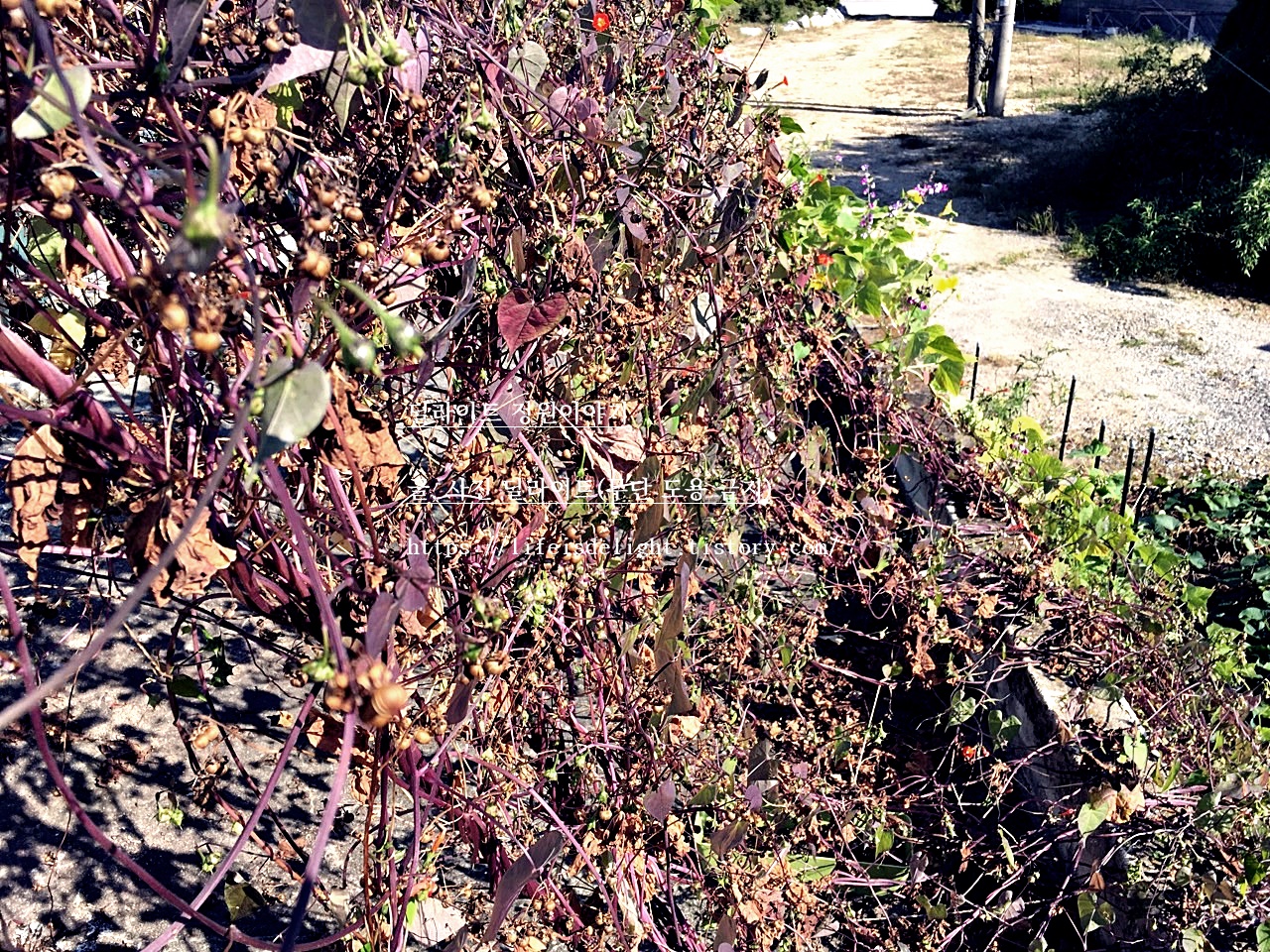 봄부터 내가 심은 적이 없는 이름 모를 풀이 자라고 있었다. 잎이 마치 콩잎 같기도 했고, 또 알아서 담장을 타고 잘 올라가기에 그냥 내버려 두었던 식물. 둥근 잎이 옥상 담장을 타고 올라가더�